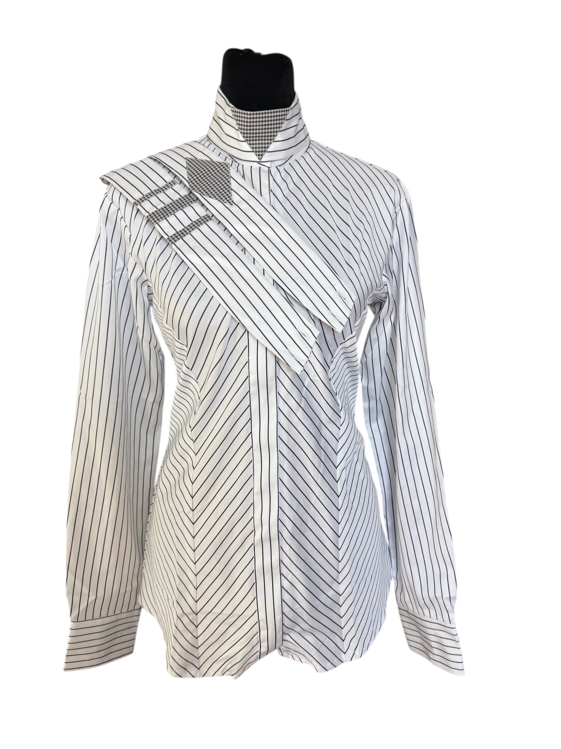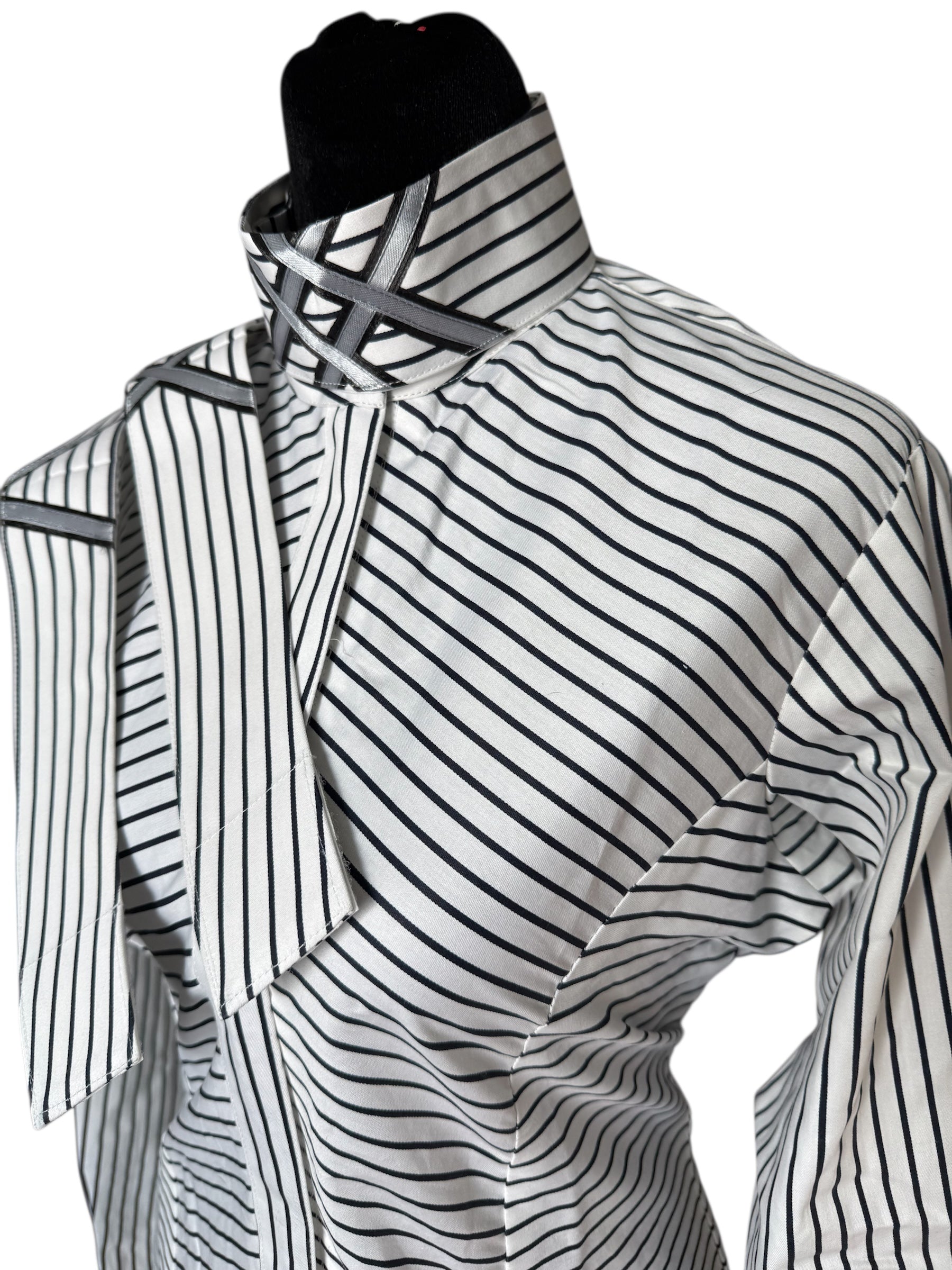 English show shirt white with navy and light blue lines. Fabric Code N685 “Hidden Zipper”