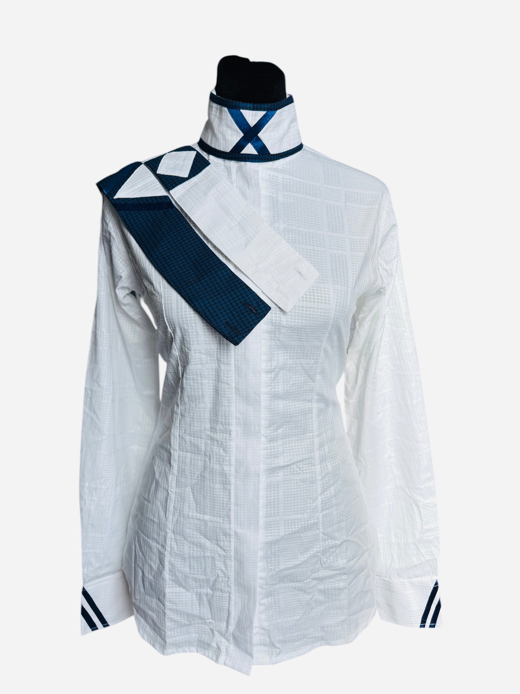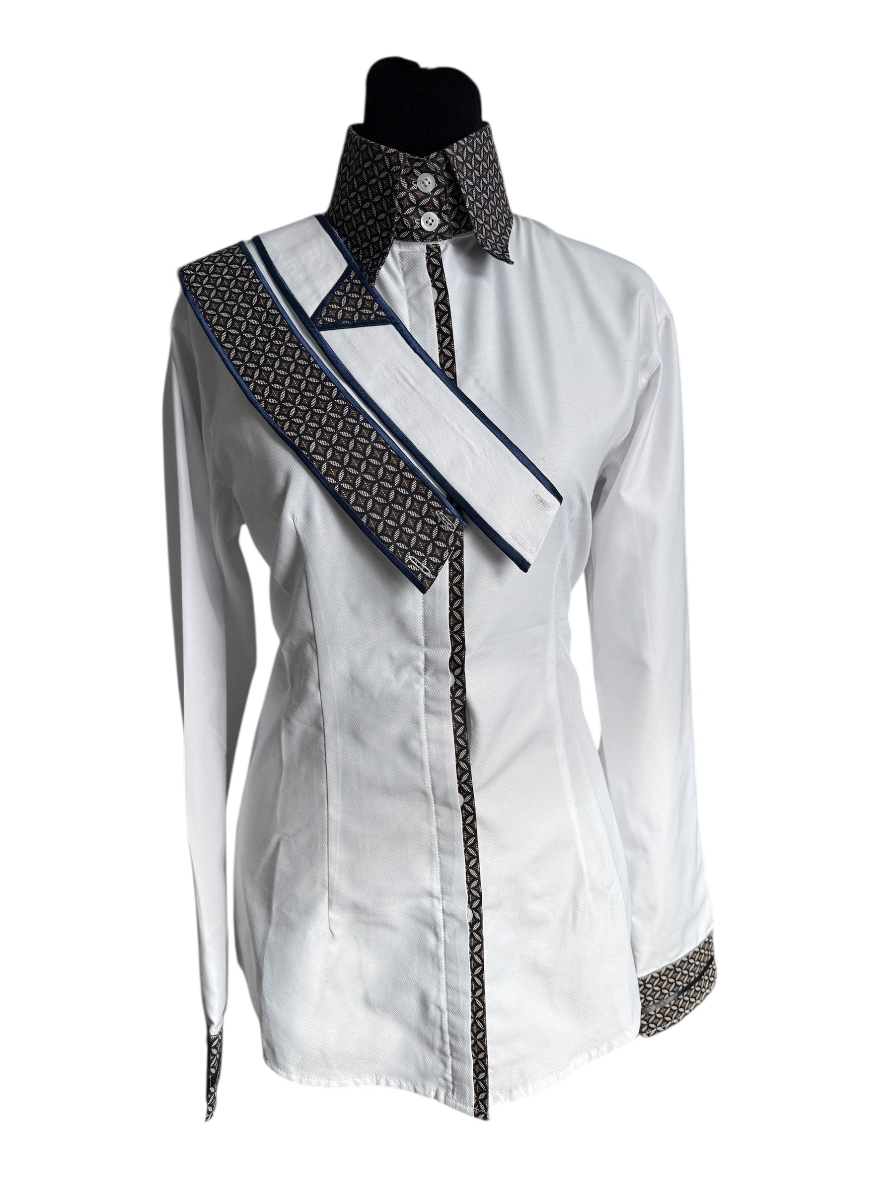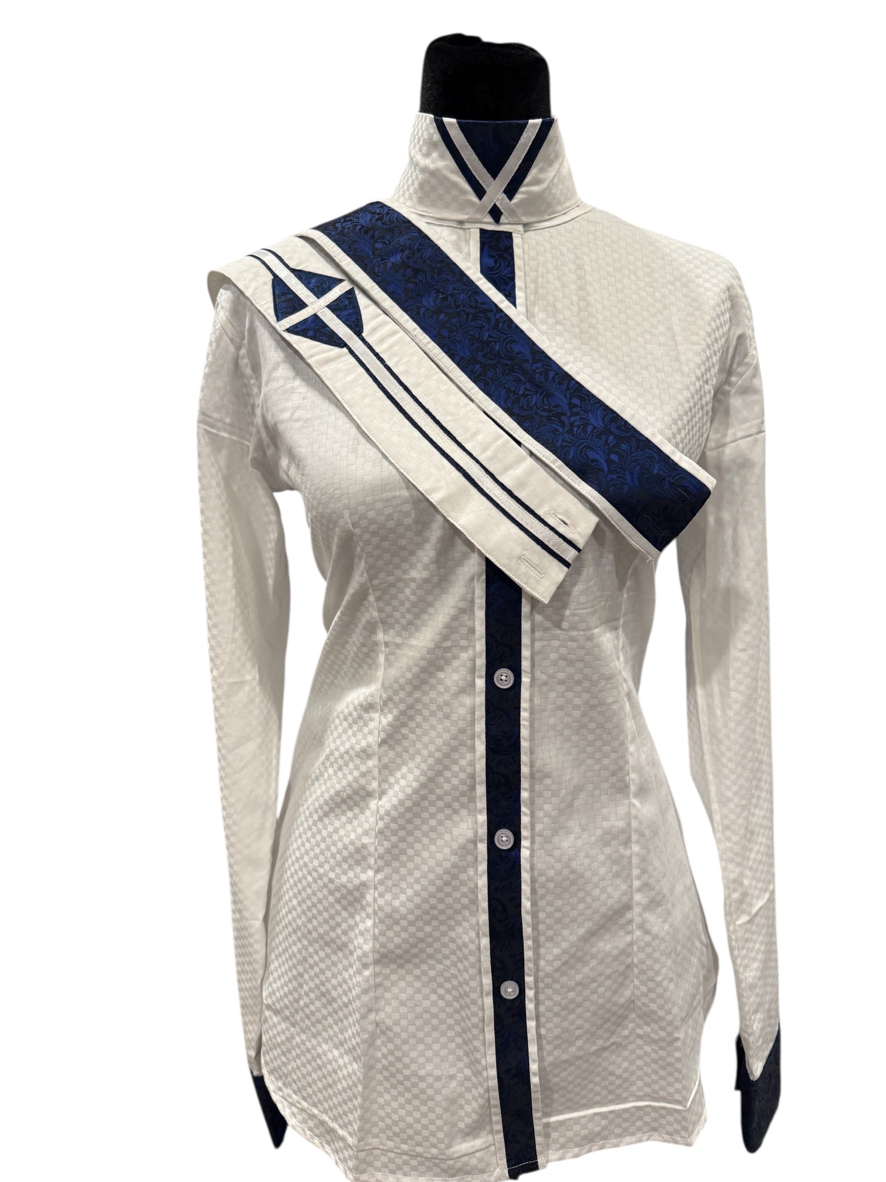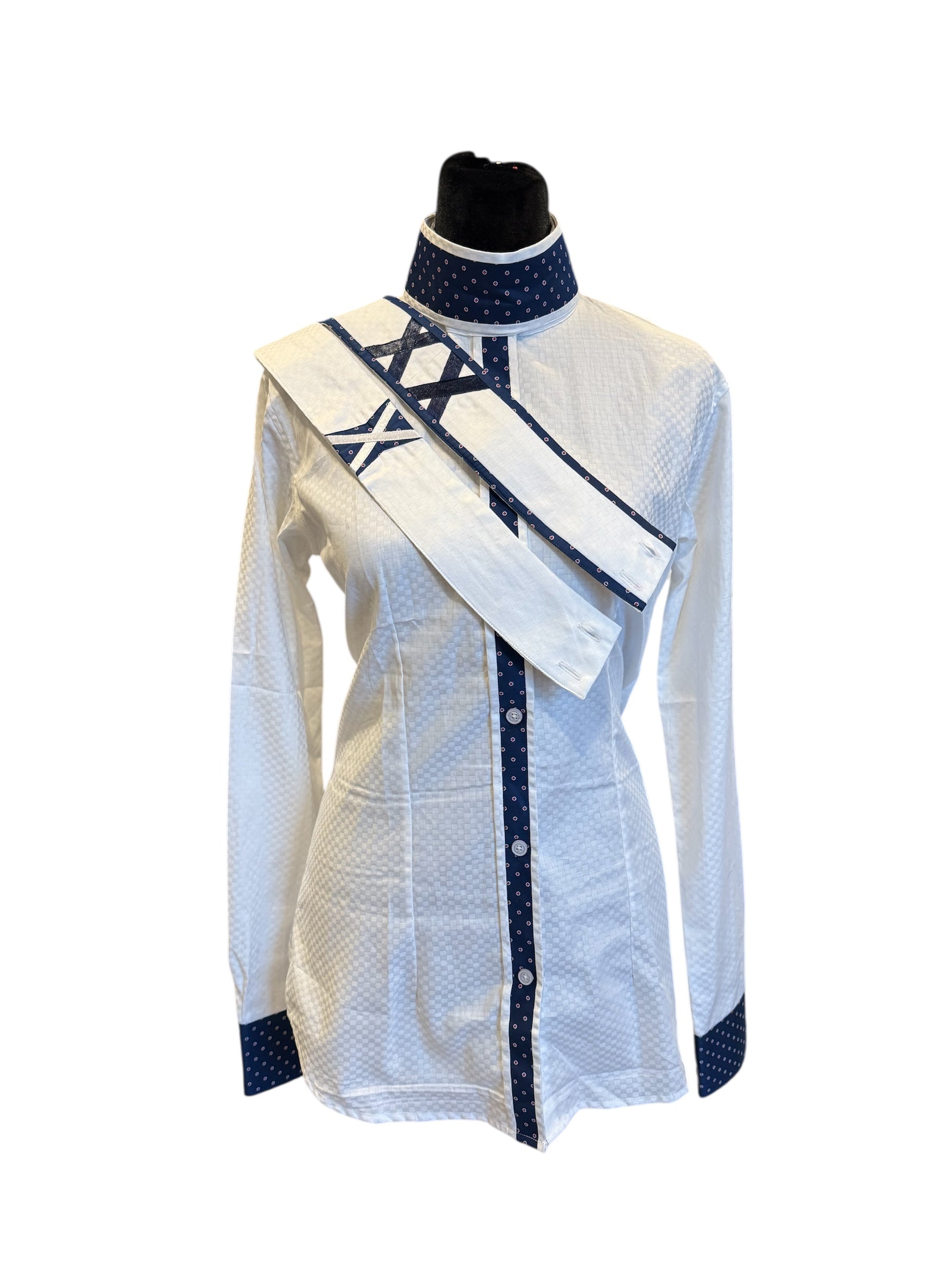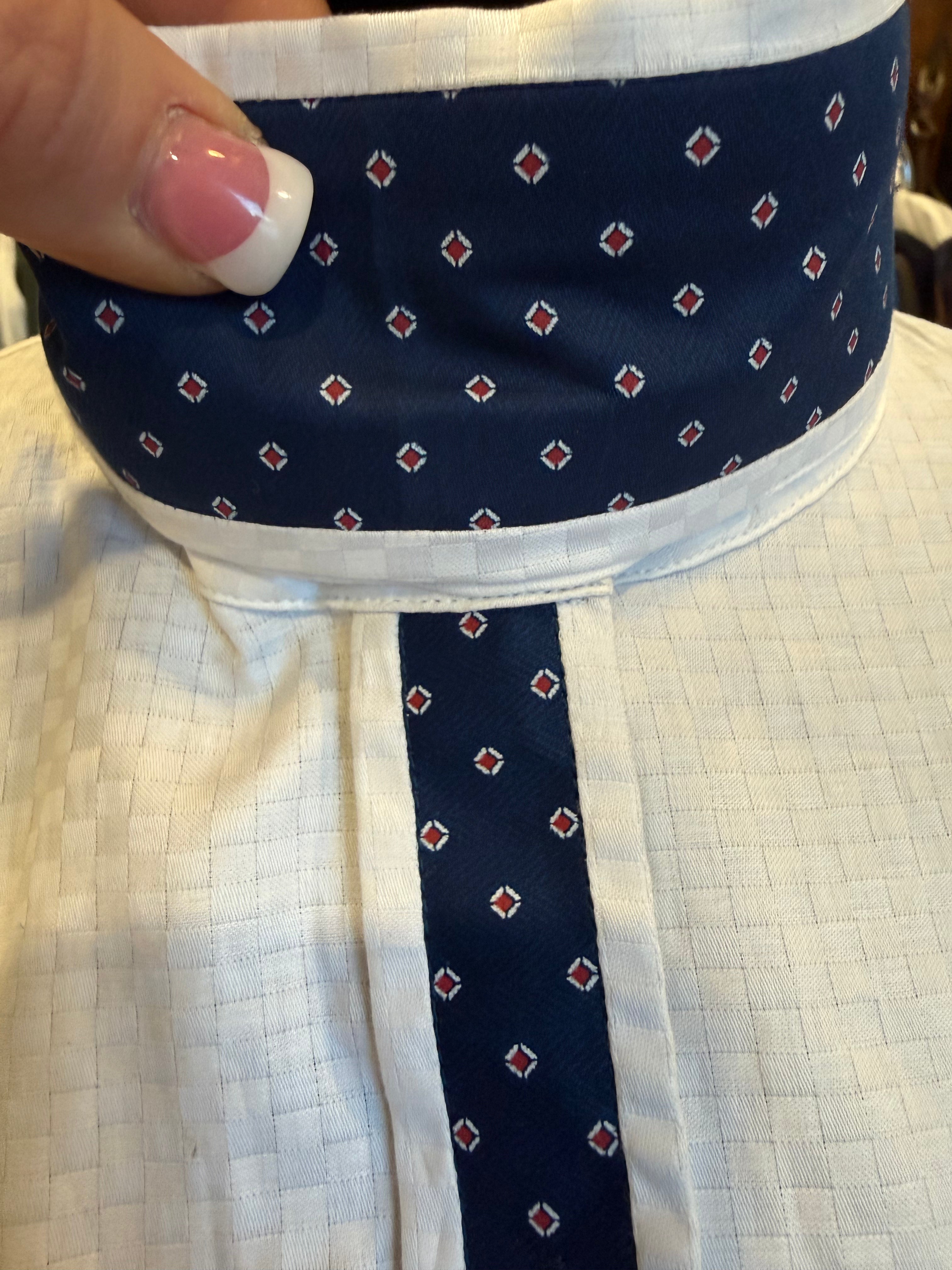 English Show Shirt White with Navy Accents. Fancy Front and Cuffs Fabric Code JAN15