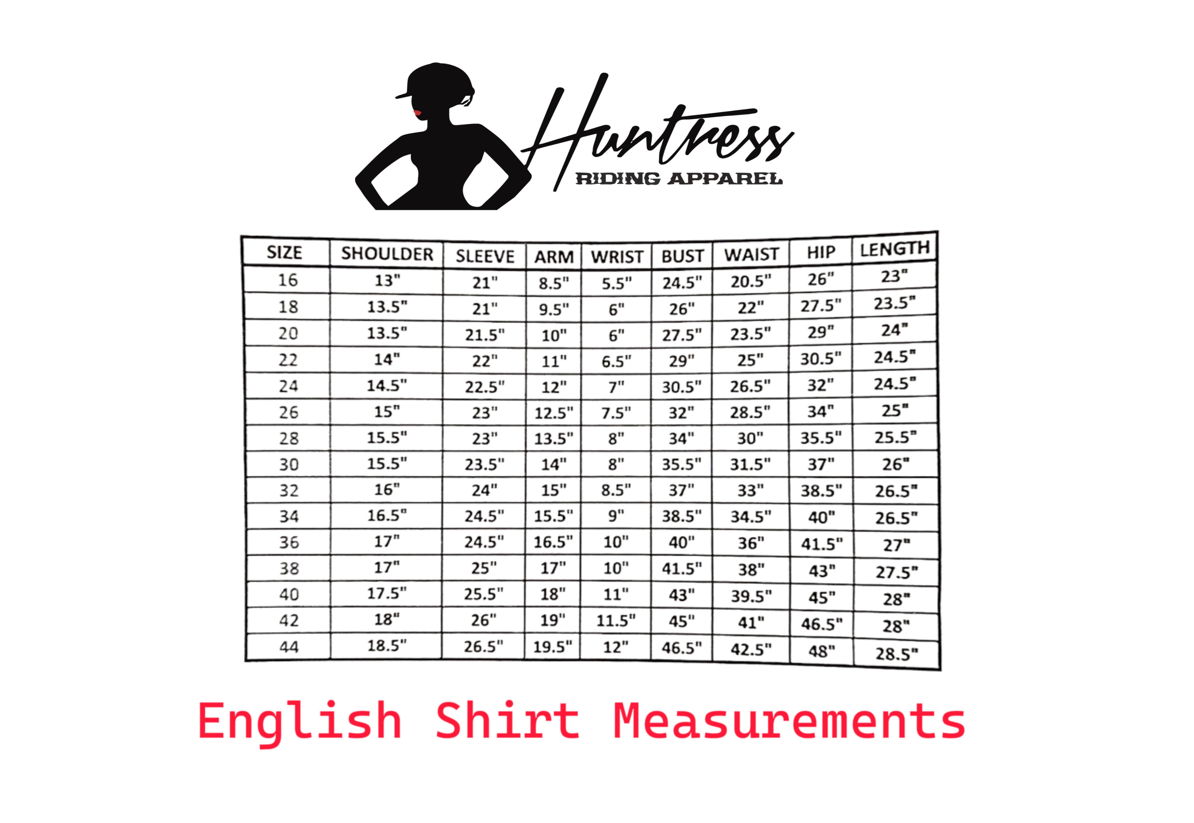 Huntress Riding Apparel is not responsible for weight loss or gain after the time the order is placed. Stock size clothing that has been altered may not be exchanged. Stock size orders can be altered at buyers expense.